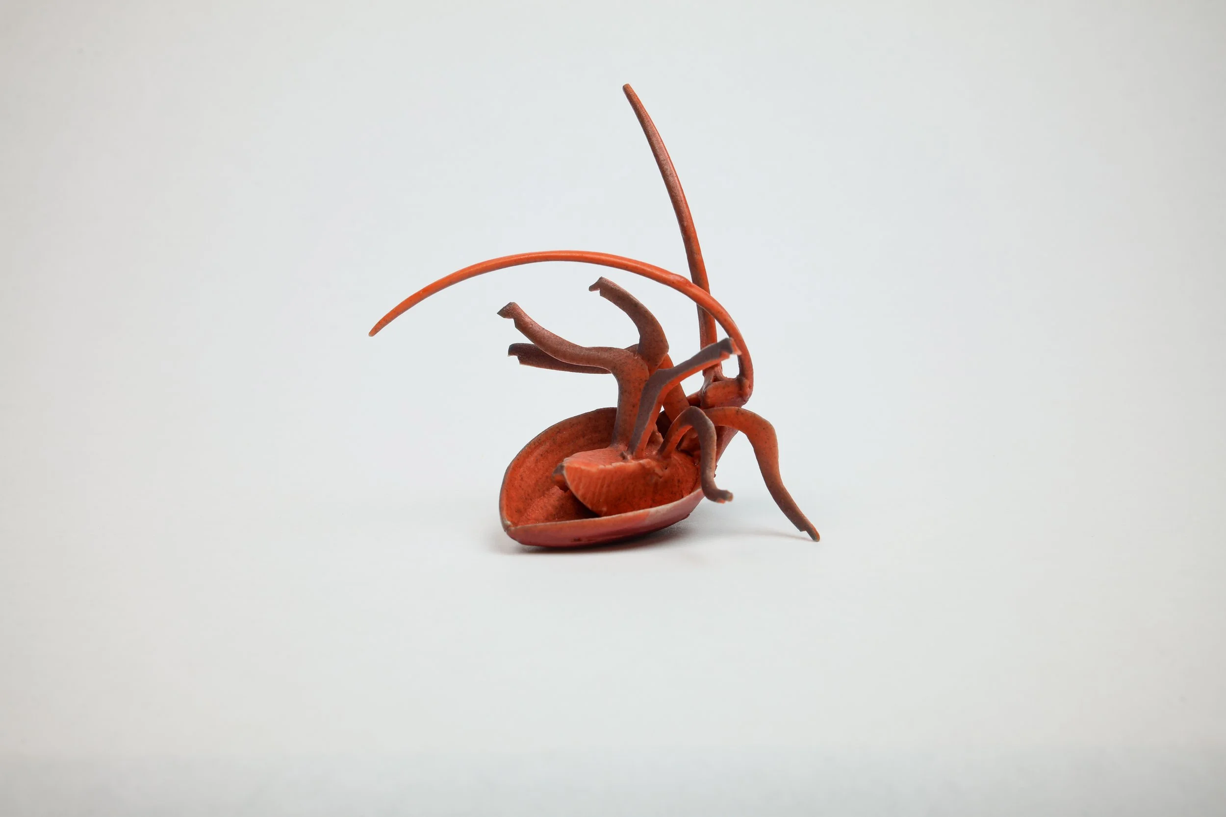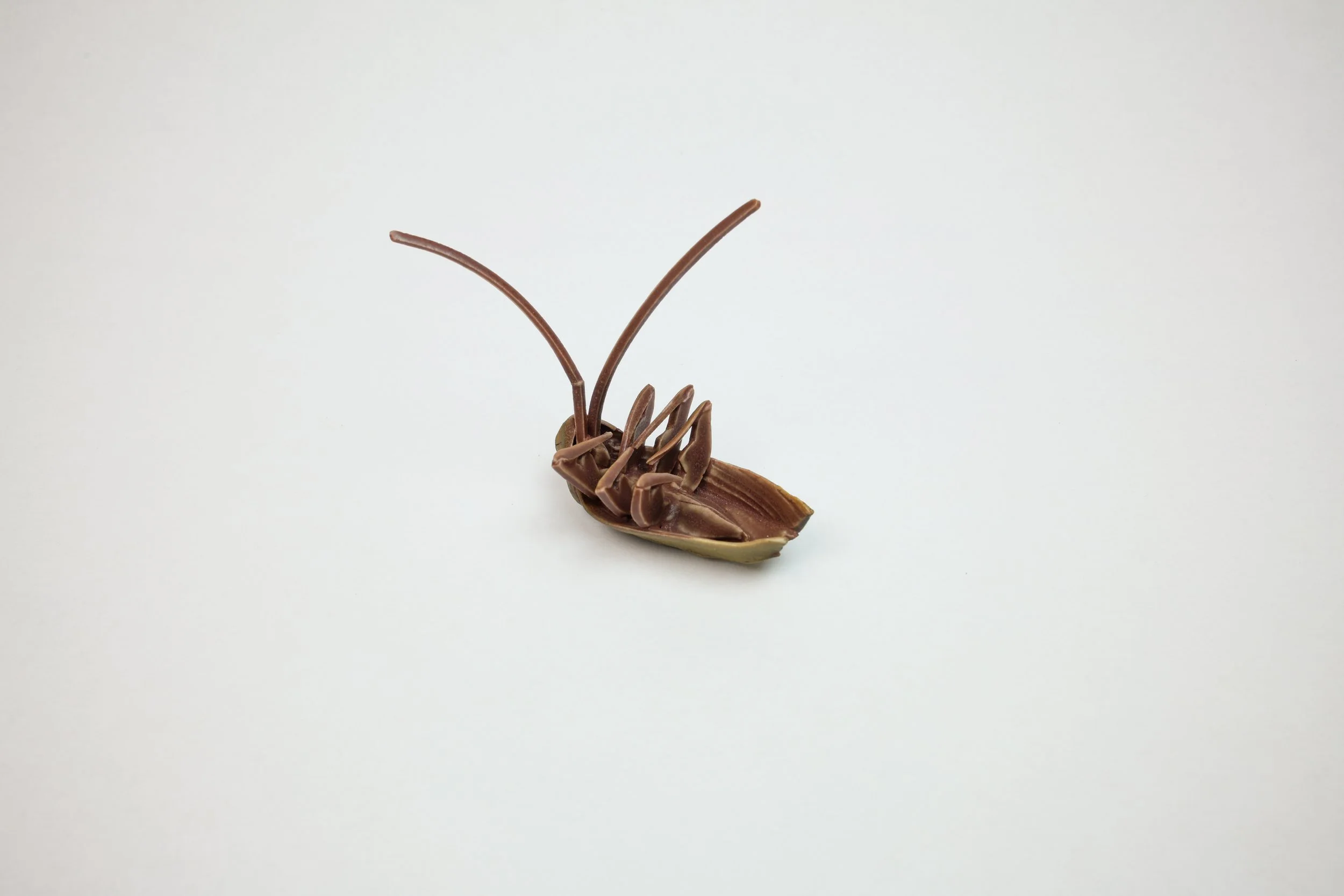 The small scale of these sculptures shows every gesture and tool mark captured by the clay, imbuing them with the touch and emotions of their maker. Viewers’ initial impulse to recoil at the sight of a cockroach is quickly superseded by curiosity, even empathy. Close examination reveals each bug to be uniquely expressive and complex, a universe all its own. Their strangeness soon falls away. Their bodies become mirrors for our bodies; their feelings reflections of our own.