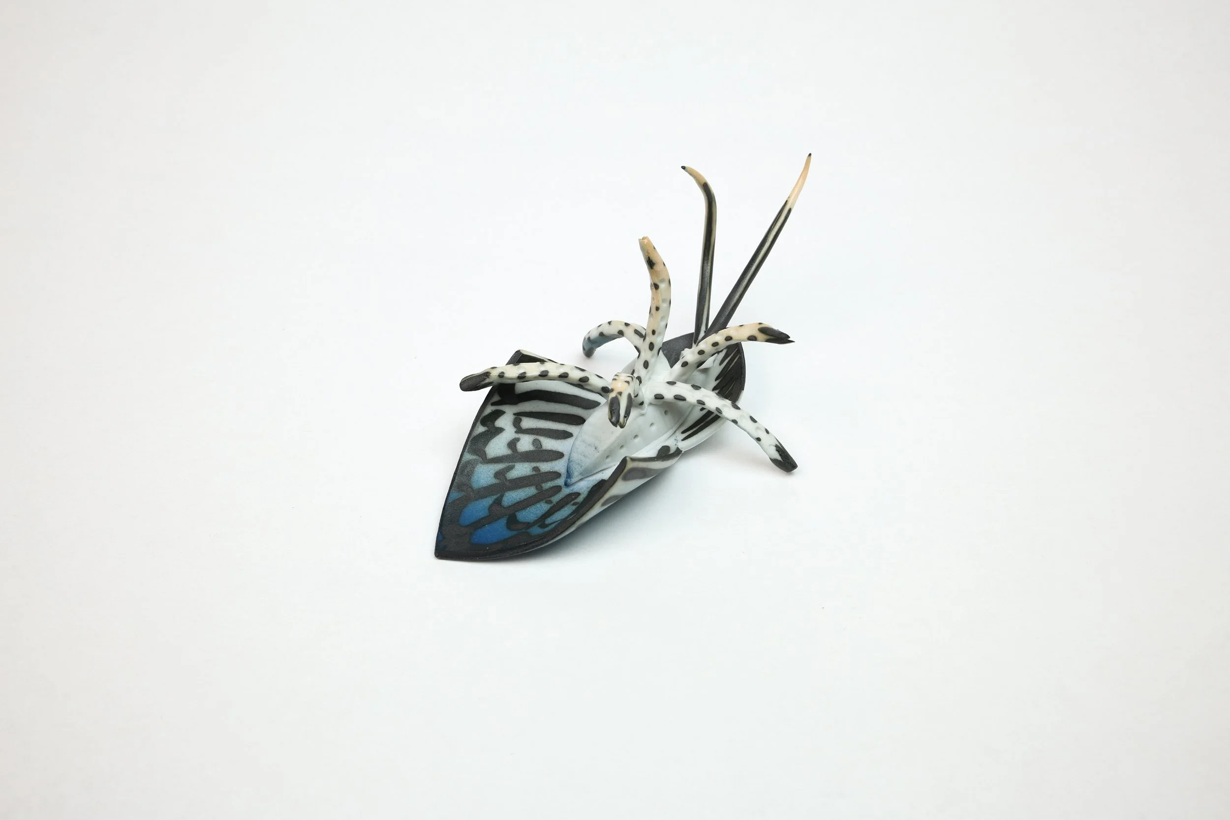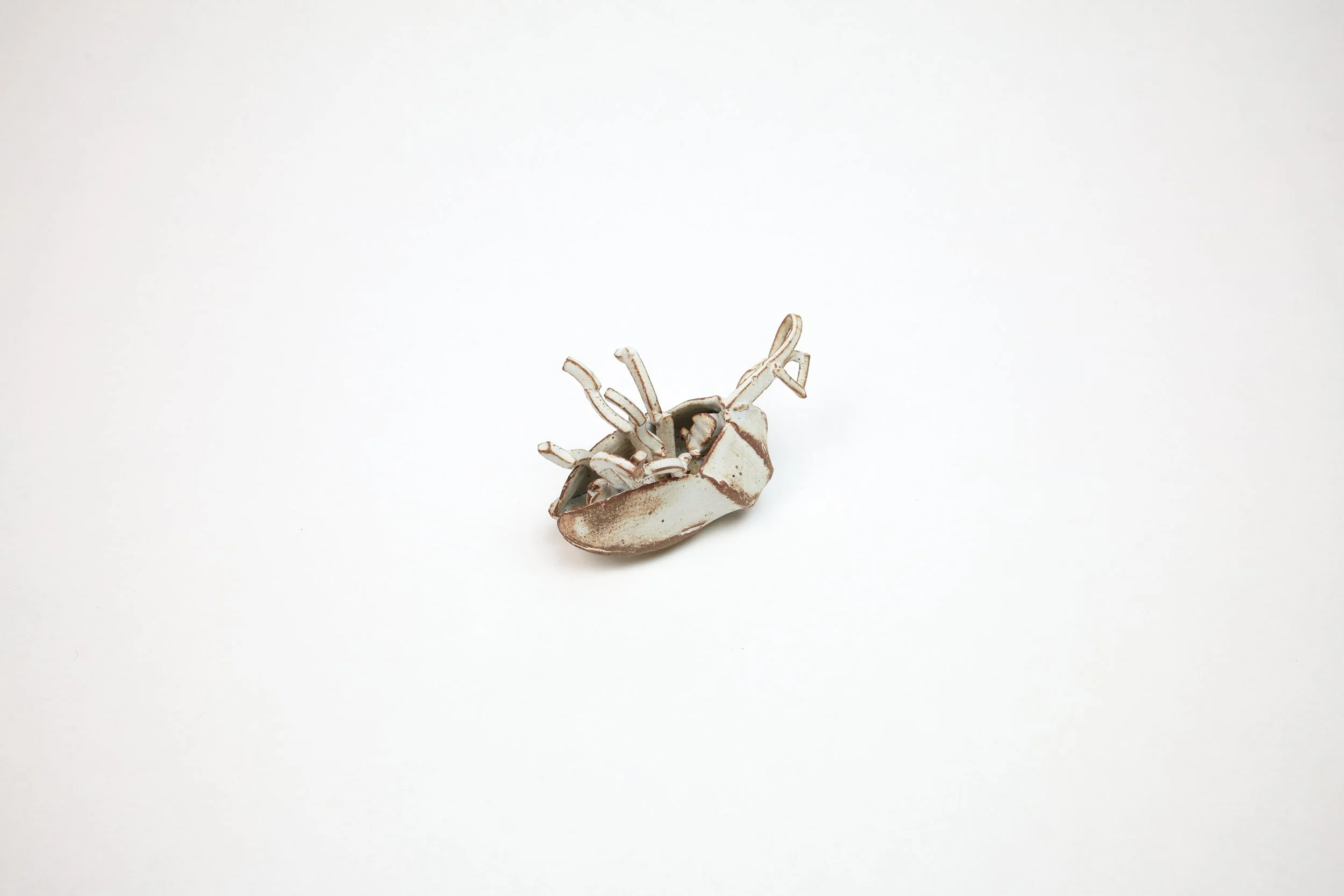 The Jane Hartsook Gallery at Greenwich House Pottery is pleased to present new ceramic sculpture by Yage Wang. In Lie Low, Wang investigates form by repeating a single motif: a dead cockroach. Creating each individual bug challenged Wang to explore how the same form could be shaped, manipulated, and experienced in a new way. Legs become sharp blades or puffs of cotton candy; the antennae turn into giant horns or delicate crowns, the wings are at times a flower, an airplane, a dumpling. The essential elements of a cockroach are bulked up or stripped away in endless variations.